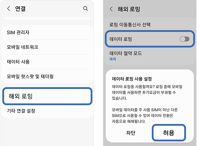 데이터 로밍 ON > 데이터 로밍 사용 설정 팝업에서 '허용' 선택